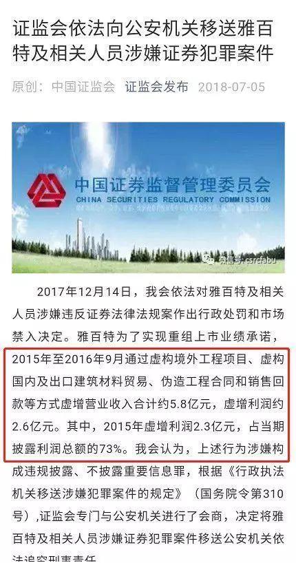 2017年4月6日,证监会对上市公司雅百特涉嫌信披违规等行为立案调查。经过调查,雅百特于2015至2016年9月期间通过虚构海外工程项目、虚构国际国内贸易等手段,虚增营业收入约5.8亿元,虚增利润近2.6亿元,其中2015年虚增利润占公司当期利润总额约73%,2016年前三季度虚增利润20%。