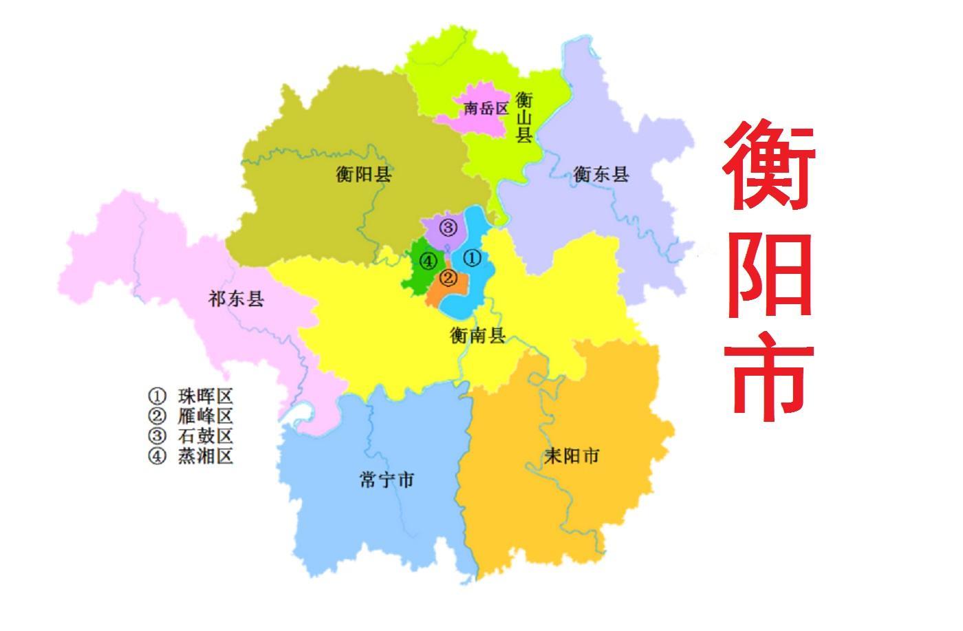 全市总面积15300平方千米,辖5个区(蒸湘区、珠晖区、雁峰区、石鼓区、南岳区 )、5个县(衡阳县、衡东县、衡南县、衡山县、祁东县),代管2个县级市(耒阳市、常宁市)。 截至2022年末,全市常住人口为657.74万人。
