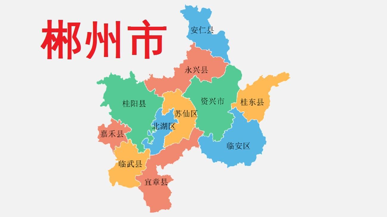 全市总面积19342平方千米,下辖2个区(北湖区、苏仙区)、8个县(临武县、汝城县、桂东县、安仁县 、桂阳县、宜章县、永兴县、嘉禾县)、代管1个县级市(资兴市)。截至2022年底,全市常住人口463.68万人。