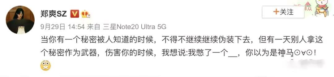 9月20日,张恒在《女儿们的恋爱》对郑爽冷暴力,引起不小争议,两人感情也就让人觉得并非看上去那般坚定不移,爱情这个壳似乎很快就要被揭开。在29日,郑爽发微博:“当你有一个秘密被人知道,不得不继续伪装下去,但有一天,别人拿这个秘密作为武器,伤害你的时候,我想说,我憋了一个(),你以为是神马!”