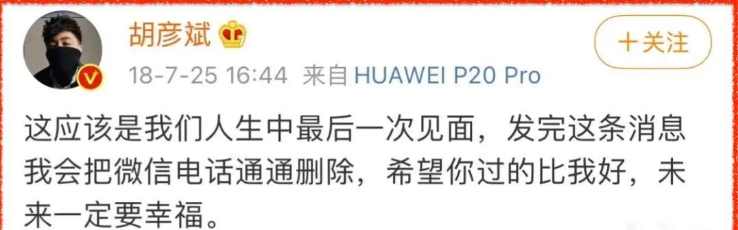 惹毛了的胡彦斌随后发了一条微博,态度坚决:“这应该是我们人生当中最后一次见面,发完这条消息,我会把微信电话统统删除,希望你过得比我好,未来一定要幸福。”
