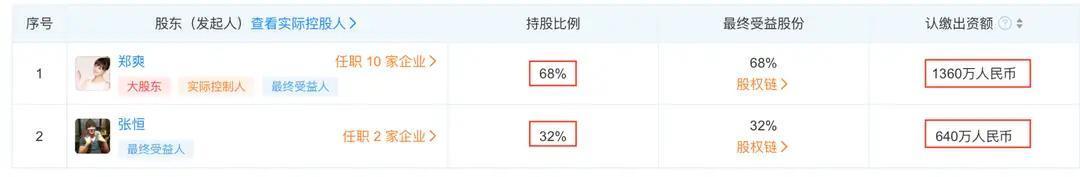在2019年1月18日,郑爽和张恒在“鲸谷座”的基础之上,又成立了一家全资子公司——上海鲸乖乖人工智能科技有限公司,开发运营产品,郑爽间接持股48.96%,为实际受益人,张恒间接持股23.04%,为公司法人。