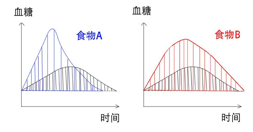 图中举例示意的为食物A和食物B,分别和对应相当含量的葡萄糖的糖耐曲线。蓝色部分面积除以黑色部分面积,乘以100%,即为食物A的GI值;红色部分面积除以黑色部分面积,乘以100%,即为食物B的GI值。