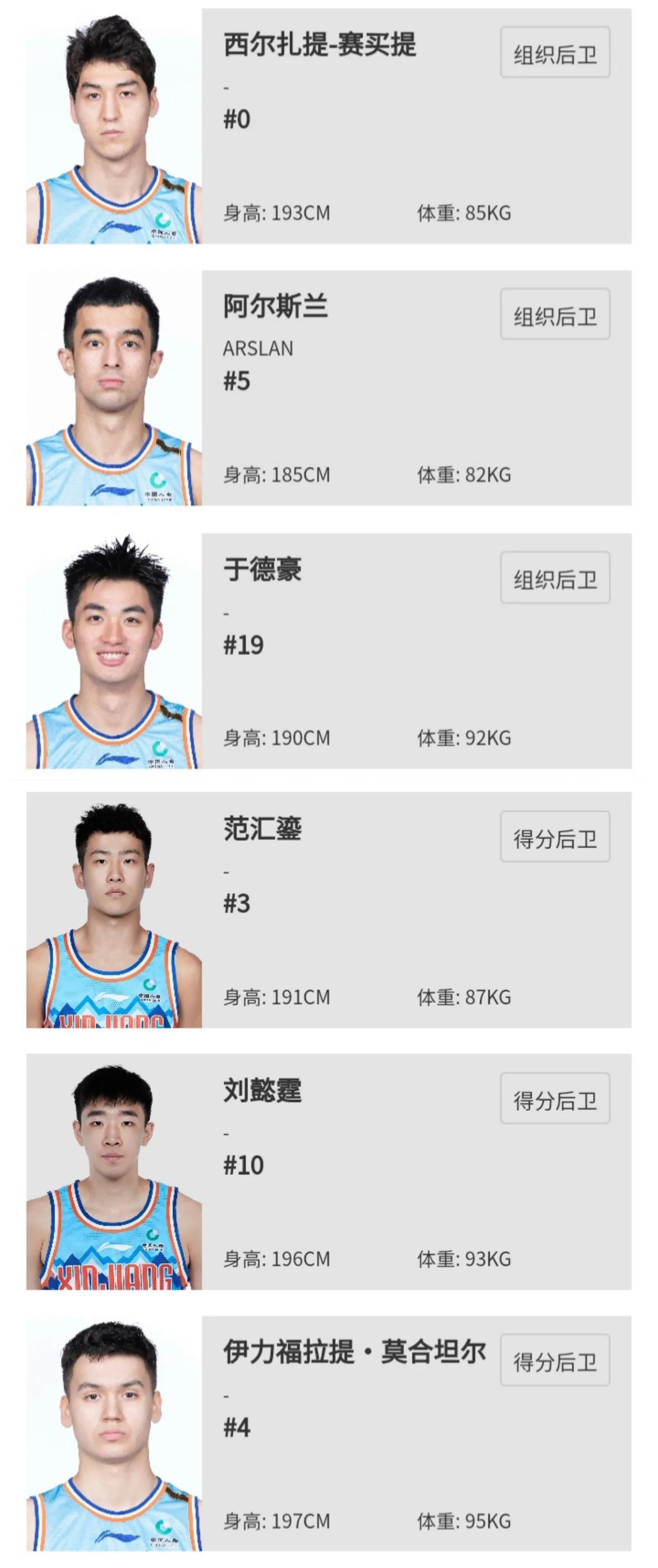 新疆队这19个球员按照各自司职的位置,可以分为后卫、小前锋、大前锋和中锋。下面这6个都算后卫,有组织后卫和得分后卫。