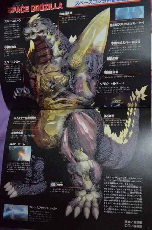作为太空来的狠角色,太空哥斯拉的身体结构极为特殊,与“结晶体”息息相关。外表上,太空哥斯拉最大的特征就是满身都长满了结晶,头上有黄色的角,双肩长着巨大的尖刺状结晶体。尾部末端有类似于剑龙的刺状结晶体,背部不再是传统哥斯拉的黑绿色背鳍,而是成排的结晶背鳍。