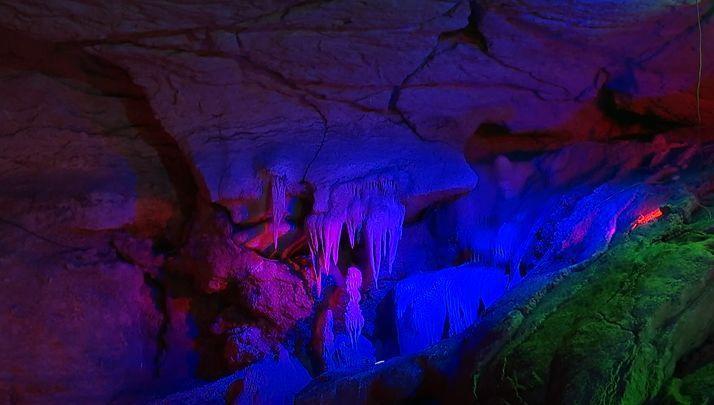 大厅有百余平方,门口有黎山圣母塑像,右侧是十大医圣的塑像。往里则是水石相间,并有瀑布的流水潺潺。中间的巨大钟乳石似是定海神针,周围则是各种奇形怪状的石头
