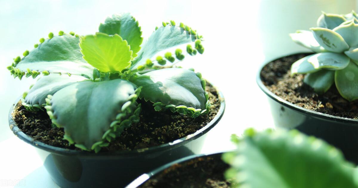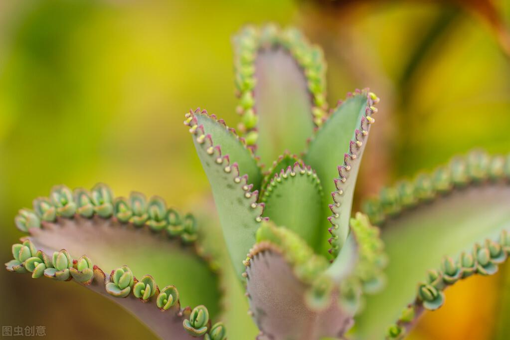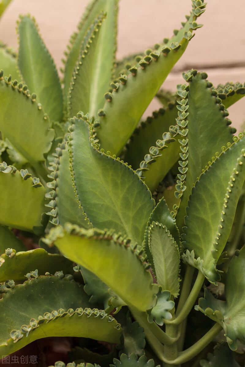 是最常见的多浆植物。其叶片肥厚多汁,边缘长出整齐美观的不定芽,形似一群小蝴蝶,飞落于地,立即扎根繁育子孙后代,颇有奇趣。