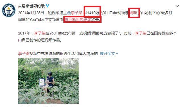此前,李子柒打破了自己曾经创下的吉尼斯纪录“最多订阅量的Youtobe中文频道”
