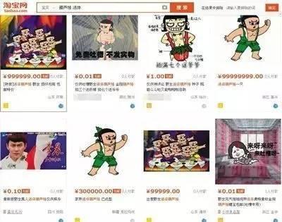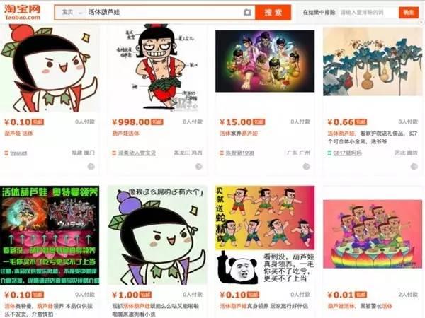小编随便在淘宝网输入“葫芦娃”进行搜索,竟然显示出有几百个类似商品,卖家正在出售的各种“葫芦娃”价格从1分到几十、几百,有的甚至标价上千上万元。而且,交易记录显示还真有人付款,最多的一个有30多个交易量,当然大部分为0交易量。