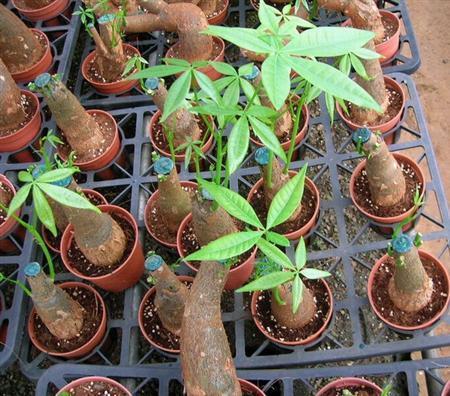 ,等小苗渐渐长大,然后再根据需要做成不同类型的发财树,比如五编或三遍造型、大型单株或小型盆栽