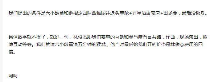 曾经,还有一位网友曝光了自己的一段经历,他曾经因为Dota比赛的彩蛋环节邀请六小龄童来现场表演,恰巧当时是猴年,而游戏中也有孙悟空一角色,不过最终的结果却是因为价钱问题,这位老艺术家的要价,是林俊杰的四倍,差不多240万左右。