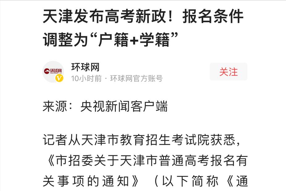 8月16日,央视新闻正式发布天津高考新政!新政指出天津市高考报名条件由单一的“户籍”要求调整为“户籍+学籍”双要求。看似平淡的政策公布,实际堪比重磅炸弹!可能读者会有疑问,这有什么重磅的?别急着下结论,先带大家回顾一下,这段时间到底发生了什么。