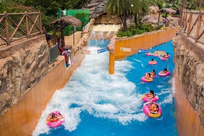 全球最大人造浪,在狭长的峡谷中一波又一波的滔天巨浪会把你一次次推向浪尖,你只需要裹着泳圈,任不断冲涌而来的巨浪把你推向前。喜欢刺激的小伙伴一定要挤到洪口,等待山洪暴发,冲到你「旋转跳跃闭着眼」什么炎热什么火躁都被洪水冲走了。