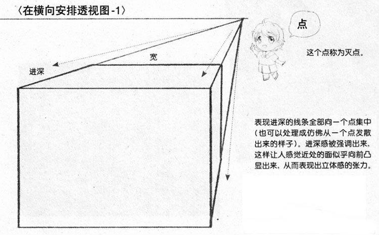 一点构图法是将物体绘制得有如立体效果的构图法。通过斜线表现出进深感,这样就能产生空间效果。是基础中的基础。