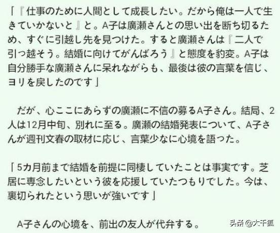 “为了工作和我分手,却不到几个月就要和新的伴侣结婚。广濑这个人真的不但说的话信不过,连最后一点节操都没有了”A子如是说到。