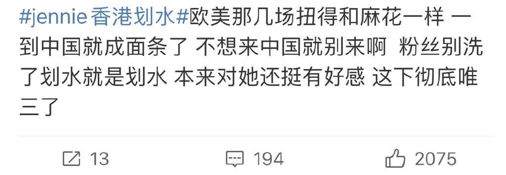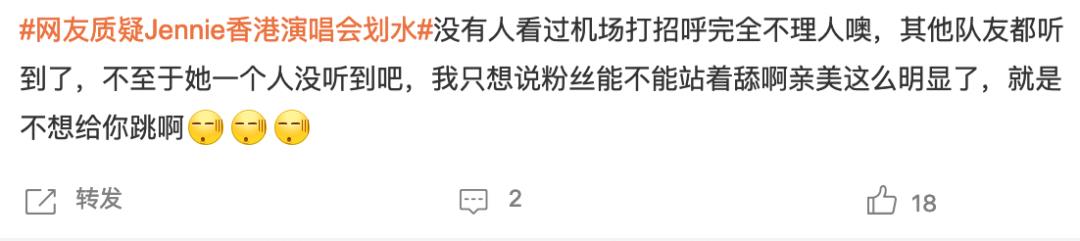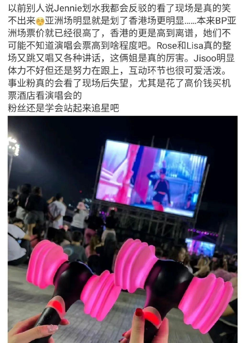 有一位去了现场的网友在微博上吐槽,称“以前别人说jennie划水我都会反驳,但看了现场时真的笑不出来,亚洲场划水明显,香港场更明显......”