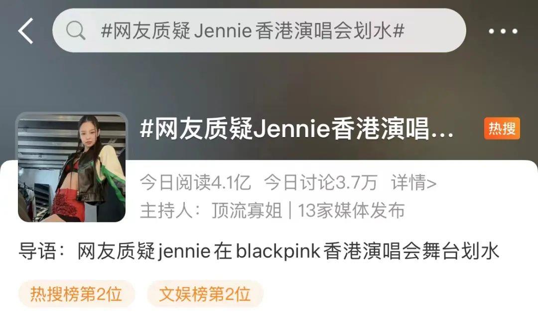 近日,#网友质疑Jennie香港演唱会划水#的词条登上了微博热搜,吸引了众多网友的关注,现在相关话题的阅读量已经4亿+,一整个大出圈。