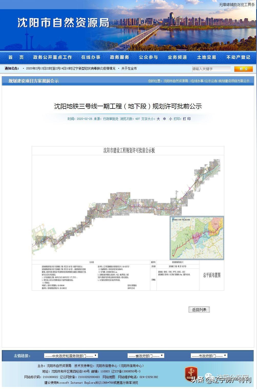 2月26日,沈阳市自然资源局官网发布了《沈阳地铁三号线一期工程(地下段)规划许可批前公示》总平面布置图,其中详细标注了线路出入口的位置。据了解,建设单位已委托设计单位按照相关技术标准和规范完成建设工程规划设计方案,并予以公示并公开征求意见。公开及征集意见日期:2020年2月24日至2020年3月3日。