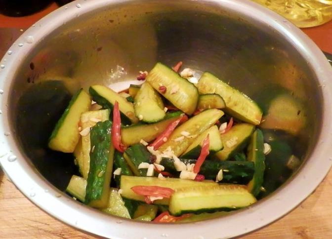 黄瓜500克,干辣椒2个,姜少许,香油半茶匙,酱油1茶匙,糖4茶匙,醋2茶匙,盐适量。
