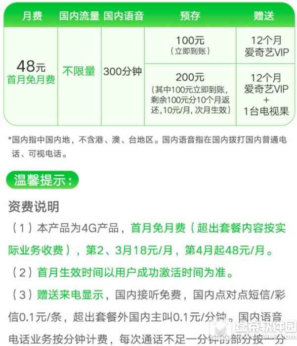 爱奇艺冰激凌套餐月租48元,不限流量,300分钟通话!
