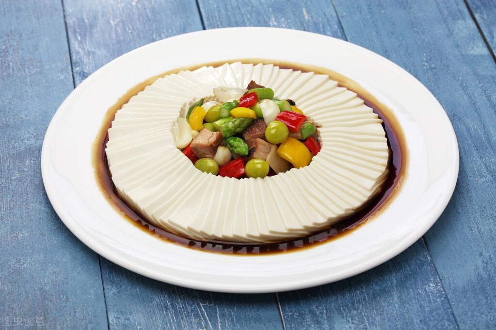3、豆腐蒸好取出,把配菜烫熟,放在豆腐中间,淋上高汤