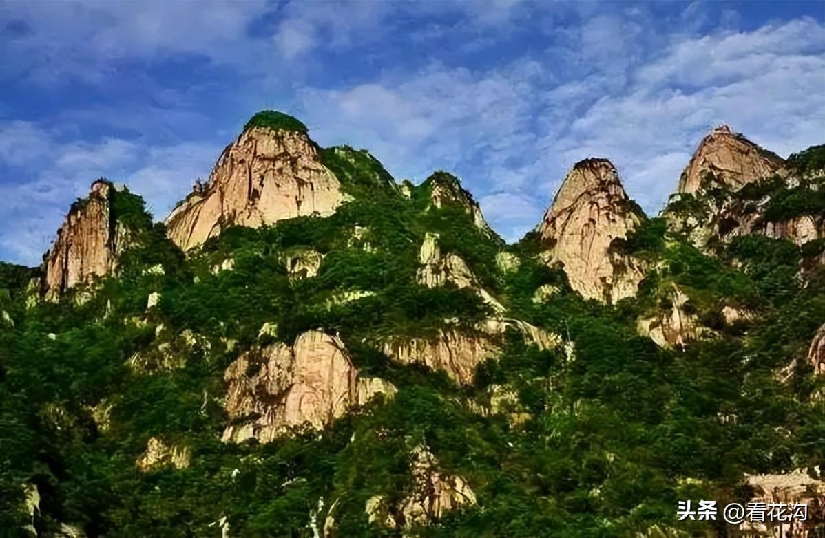 14.南召县的著名景点-五朵山景区。位于南阳市南召县西南部伏牛山东南麓,距南召县城38公里,南阳市区80公里,207国道转景区旅游公路可达,是集道教文化、旅游观光、休闲度假为一体的山岳型风景旅游区。景区占地面积100多平方公里,地质结构奇特,地势地貌复杂,北大河和排路河呈“八”字形向上延伸,主峰海拔1715米,山势巍峨,峰峦叠嶂,在南北一线三公里内并连矗立的五朵突兀山峰高耸入云,势成五极,气势宏伟。五朵山风景区属北亚热带大陆性季风气候,光照充足,雨量充沛,温暖湿润,四季分明。景区内林木蓊郁,凉爽宜人,森林、植被覆盖率达到90%以上,其中有猕猴桃、山药、茱萸、刺梨、山脊、猴头、山漆、苍术等木本、草本植物110科、850种,麝香、金钗等名贵药材300多种,豹、鹿、野猪、野羊、松鼠、刺猥、狼、獾、山兔等各类动物600多种。