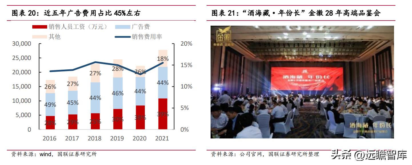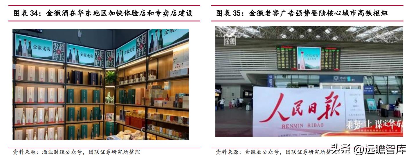 公司在西北 6 省 30 城,华东 4 大枢纽站点 19 座重点城市打造涵盖机场、高铁、户外大牌等纵贯陆空的立体广告矩阵,完成西北、华东两个核心发展区的品牌强覆盖;并根据产品特性、消费市场对主导产品进行分类广告投放,例如在西北地区高频投放金徽 28、金徽 18 等引领消费升级,在华东市场则主推金徽老窖系列,各有侧重。