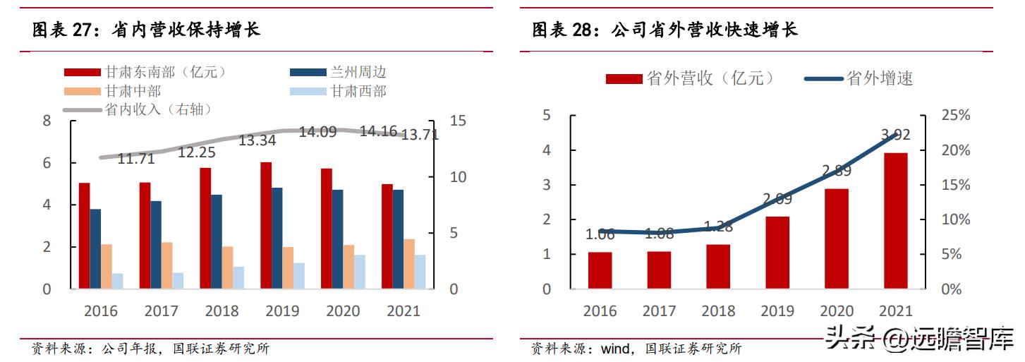 2016-2021 年,金徽酒省内营收从 11.71 亿元增至 14.16 亿元,5 年 CAGR3%,产品主要销量来自于甘肃东南部和兰州周边地区。金徽酒在省内坚持“不饱和营销”策略,不追求短时间内迅速提高市场份额,而是坚持产品结构调整,以时间换空间,以结构换规模。