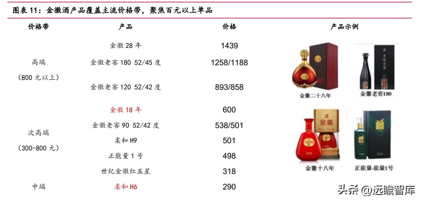 次高端和中端价格带产品分布密集,公司重点培育的核心单品金徽 18 年、柔和 H6、世纪金徽五星及正能量 3 号均位于该价格带区间。
