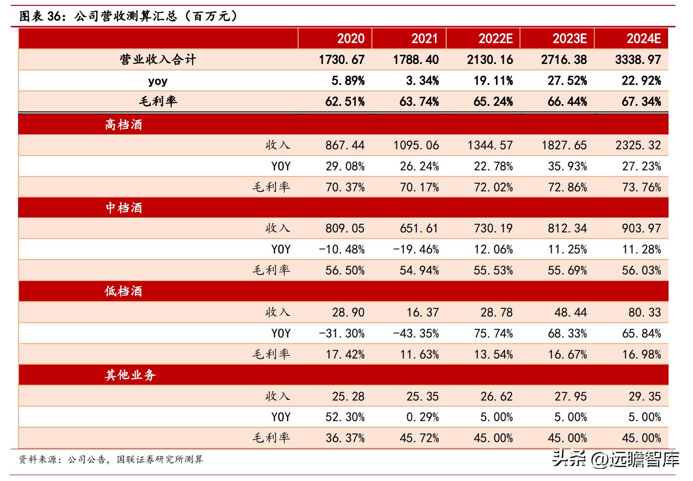 预计未来三年高档酒营收分别为 13.45/18.28/23.25 亿元,同比增速分别为 22.78%/35.93%/27.23%,3年 CAGR 为 23.14%;中档酒营收分别 7.30/8.12/9.04 亿元,同比增速分别为 12.06%/11.25%/11.28%,CAGR10.62%;低档酒营收分别为 0.29/0.48/0.8 亿元,同比增速分别为 75.74%/68.33%/65.84%,CAGR70.01%。
