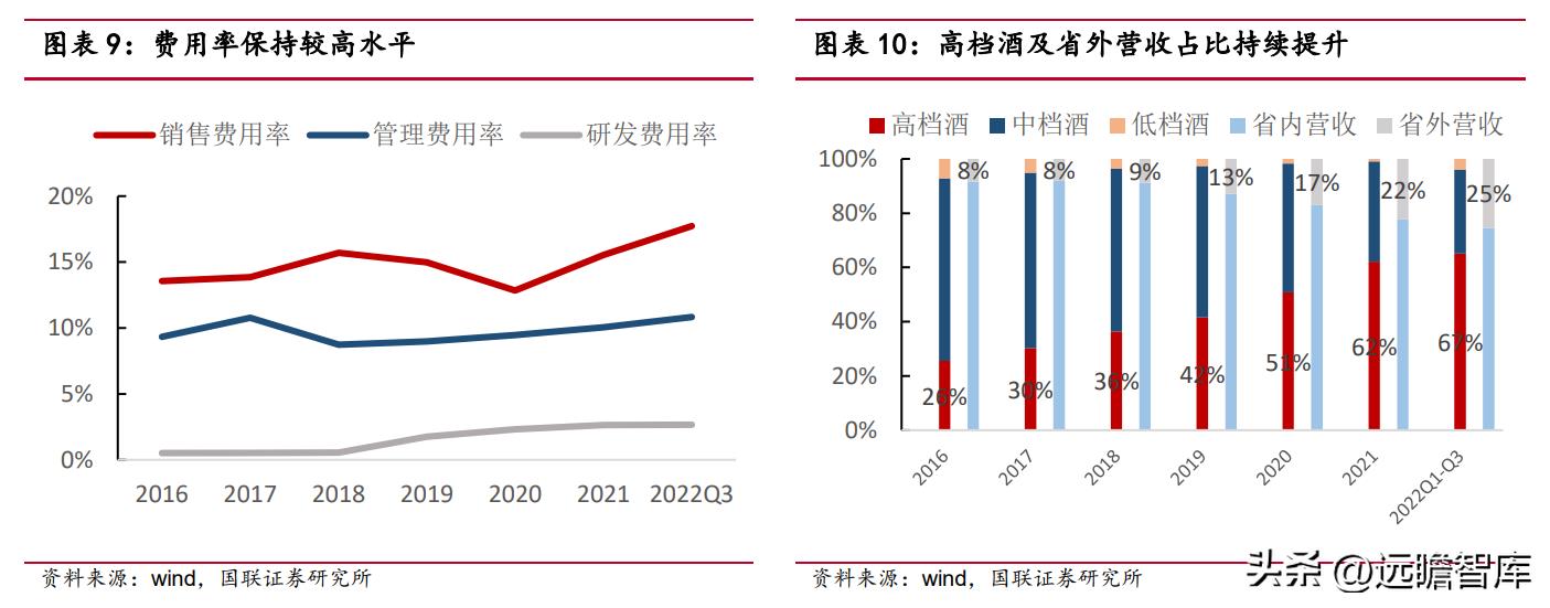2022 年高档酒在疫情影响下仍保持较快增长,低档酒由于低基数表现较为突出。2022Q1-Q3 高档酒实现收入 10.31 亿元,同比增长 17.98%,占比进一步提升至 67%;中档酒实现收入 4.89 亿元,同比增长 11.81%;低档酒实现收入0.2 亿元,同比增长 68.03%。