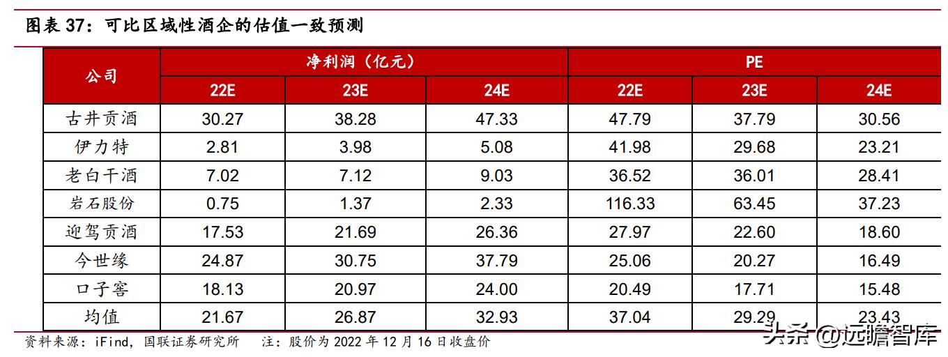 随着公司持续投入品牌建设,扩大产品在西北地区市占率并有序推进华东等市场拓展,参考各省酒龙头及具有全国化倾向的酒企,根据可比标的 22-24 年平均 PE 水平,公司估值仍具备上升空间。