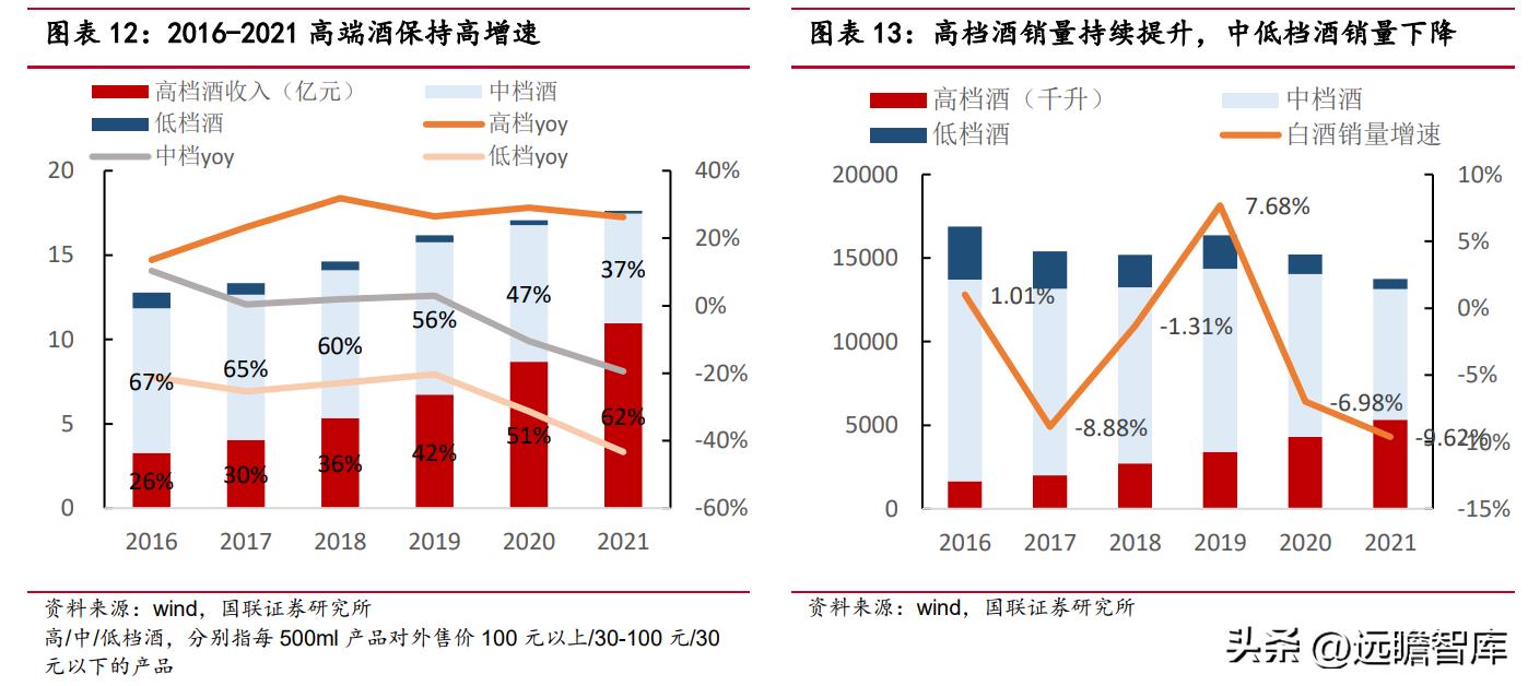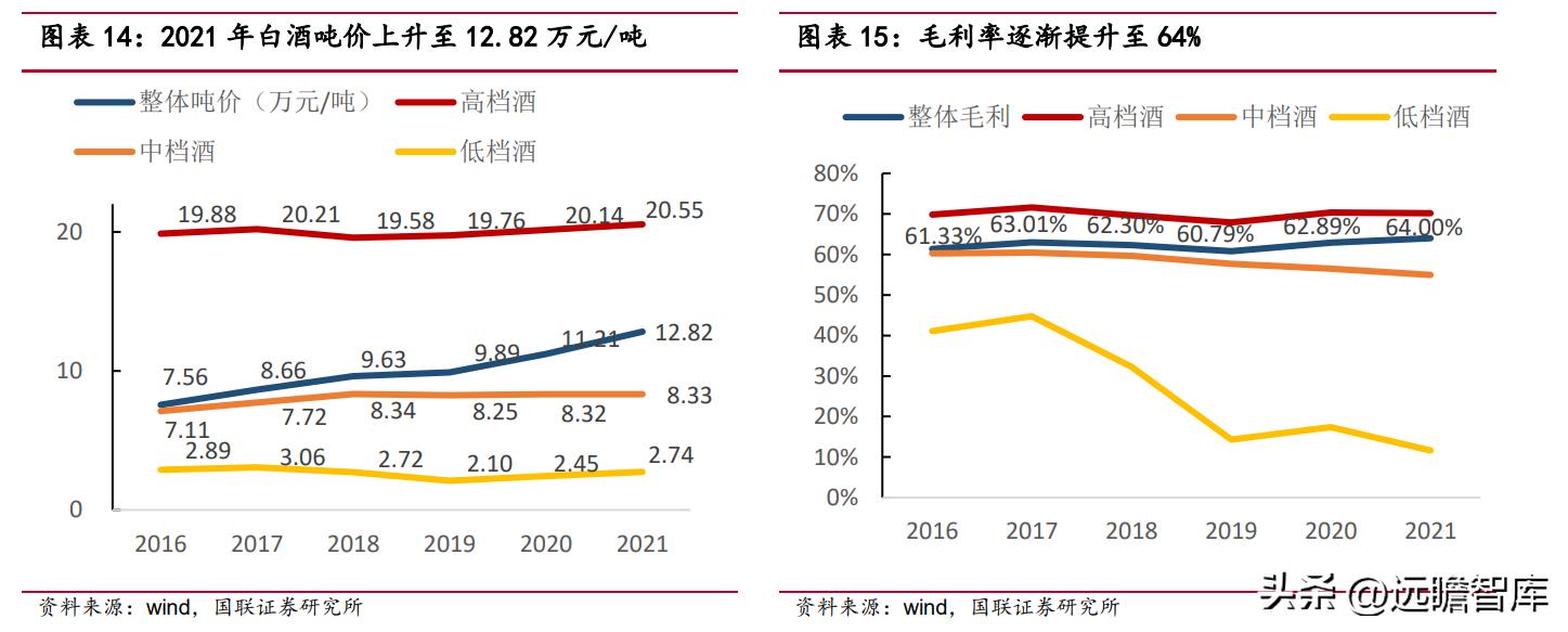 2016-2021 年白酒整体吨价增幅达 70%,主要由高端产品销量拉动。