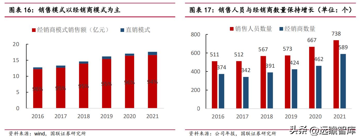 优选经销商后维护和发展是运营重点,公司向终端门店派驻销售人员,落实营销政策的同时 协助门店和经销商开拓市场,加强厂商与经销商、门店的深度合作;同时,通过基础数据系统和防伪溯源系统对产品入库、配送、终端消费等情况进行监控,加大对终端的掌控力度,近年公司经销商数量与销售人员数量逐年增加,分别从 2016 年的 374 家/511 人增至 2021 年的 589 家/738 人。