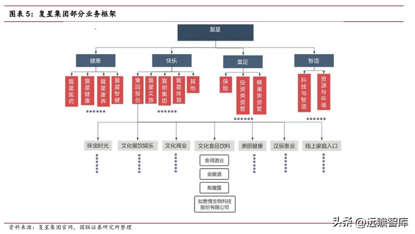 复星围绕健康、快乐、富足、智造四大板块进行投资,其中快乐板块的豫园股份涉及文化餐饮娱乐、文化食品饮料等多个领域。