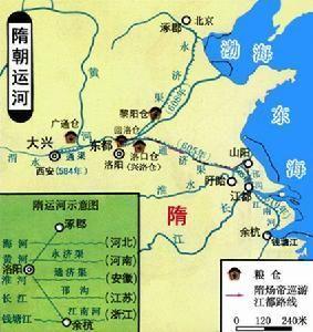 再一个工程就是大运河的开凿。在修建洛阳的同一年,实际上已经开始了。隋炀帝先后开凿疏浚了由黄河进入汴水,再由汴水进入淮河的通济渠;还有从淮河进入长江的邗沟;从京口(现在江苏的镇江)到达余杭(现在浙江杭州)的江南河;引沁水向南到达黄河,向北到达涿郡(现在的北京)的永济渠。这些渠南北连通,就是历史上有名的大运河。大运河从北方的涿郡到达南方的余杭,南北蜿蜒长达五千多里,成为一个很重要的水运大动脉。