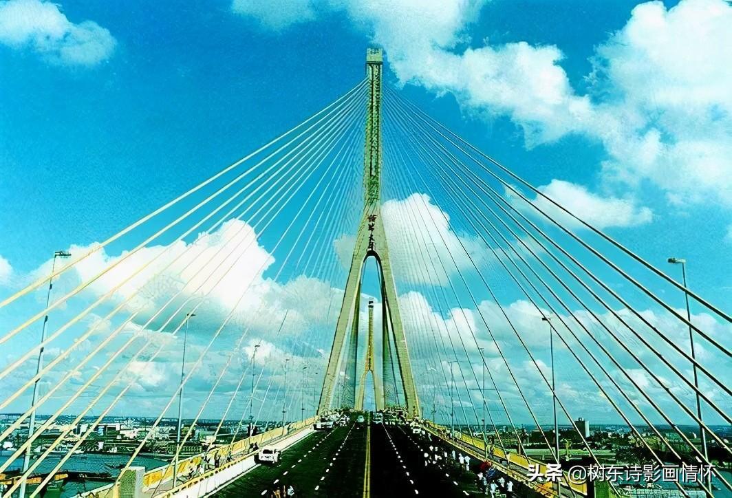 杨浦大桥是上海的一座跨越黄浦江的中国自行设计、建造的大桥。杨浦大桥于1991年4月29日动工,1993年9月15日建成,历时仅2年5个月,并于同年10月23日通车。总长8354米,其中主桥全长1178米(孔跨布置为45m+99m+144m+602m+144m+99m+45m),602米长的主桥犹如一道横跨浦江的彩虹,在世界同类型斜拉桥中雄居第一。桥塔两侧各以32对钢索连接主梁索面,呈扇形分布。桥下可通行5.5万吨级巨轮。
