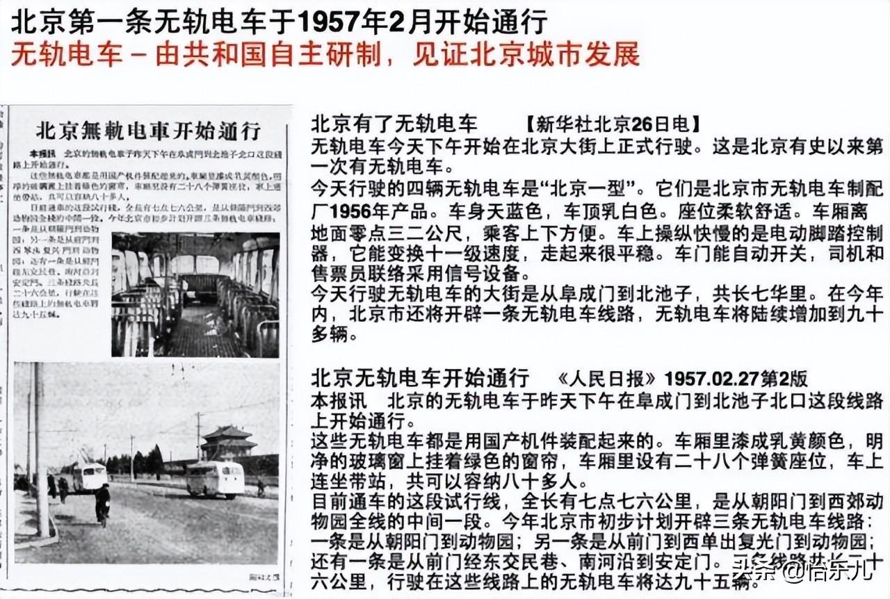 1956年10月17日,“京一型”BK540型无轨电车首次试车,零时二十分,从阜成门出发,途径北海,再到朝阳门,行程1300多米。至1963年共有199辆投入运营。