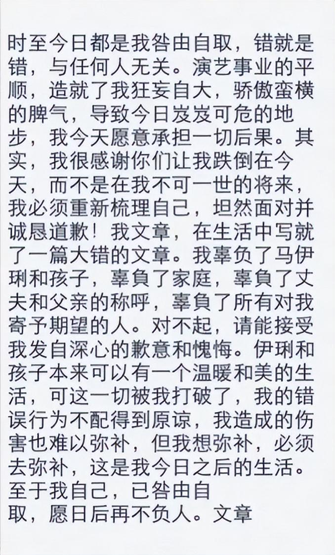他在网络上写了一封道歉信,语气诚恳地向马伊琍认错,一切都是他自己咎由自取,怪不得任何人。
