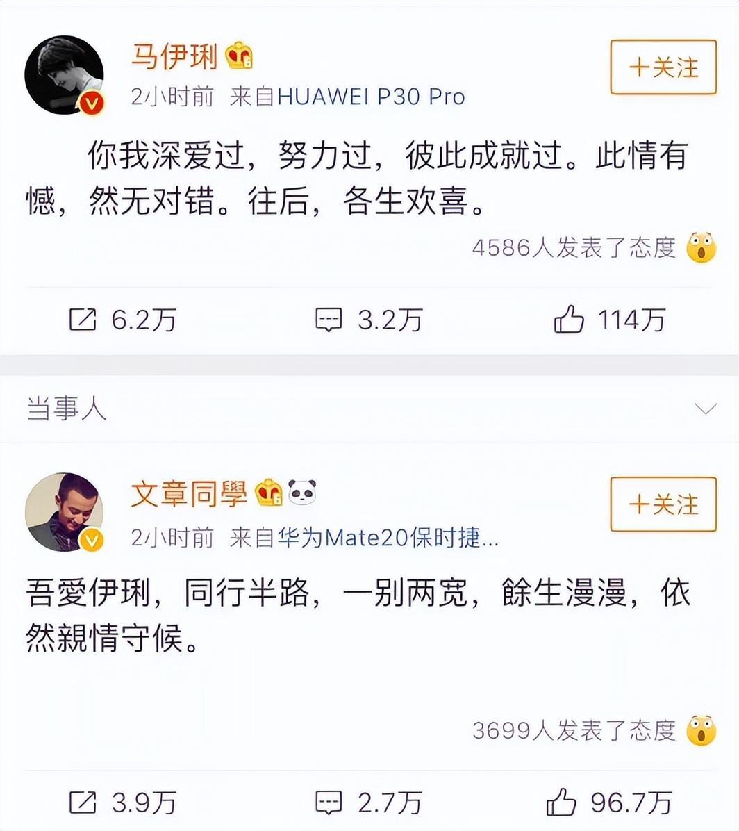 2019年,文章和马伊琍的婚姻走入了尾声,二人在微博上互相感谢彼此的付出之后,静静地结束了这一切。