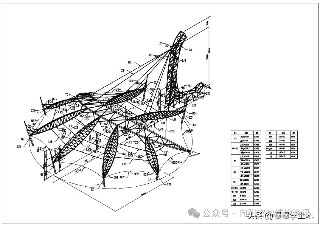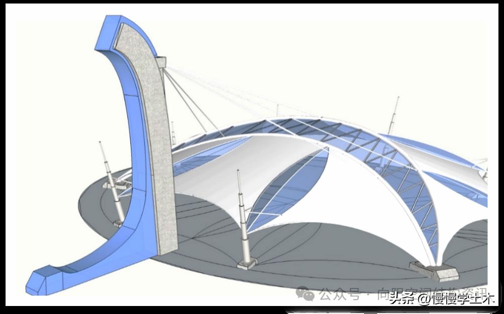 1.膜结构演艺广场一周由七根斜撑立柱环绕支撑膜结构骨架。斜撑立柱为单立柱结构,单立柱通过支撑桁架与主拱连接,形成一个稳定的结构体系。斜撑立柱一方面起到支撑稳固膜结构骨架的作用,另一方面通过细节的处理又具有了美观性。