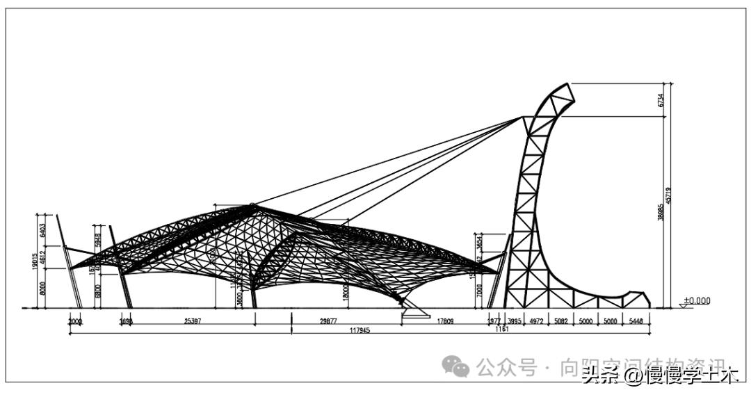 该结构整体跨度大,直径90米,塔架高,高度约45米;经过分析,塔架采用管桁架结构,下部主拱采用单管结构,通过斜拉索与塔架连接。其余立柱为单立柱结构,单立柱通过支撑桁架与主拱连接,形成一个稳定的结构体系。