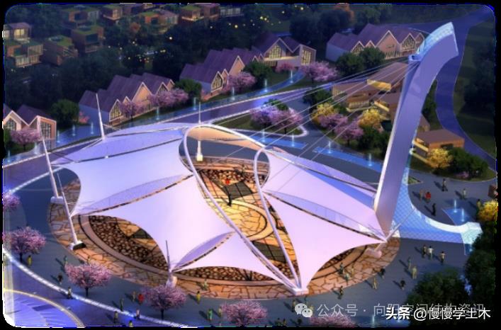 膜结构演艺广场的设计采用以概率理论为基础的极限状态设计方法,用分项系数的设计表达式进行计算。膜结构是指通过拉索将膜材料张拉于结构上而形成的,膜结构也可称为索膜结构,是由稳定的空间双曲张拉膜面、支承桅杆体系、支承索和边缘索等构成的结构体系。膜结构由于具有形象的可塑性和结构方式的高度灵活性、适应性,所以此种方式的应用极其广泛。