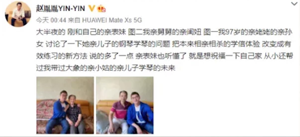 而赵胤胤很快就做出了回应,原来照片中的女孩是他的亲表妹,同时他还晒出了自己和姥姥、舅舅的合照,力证二人的亲属关系。
