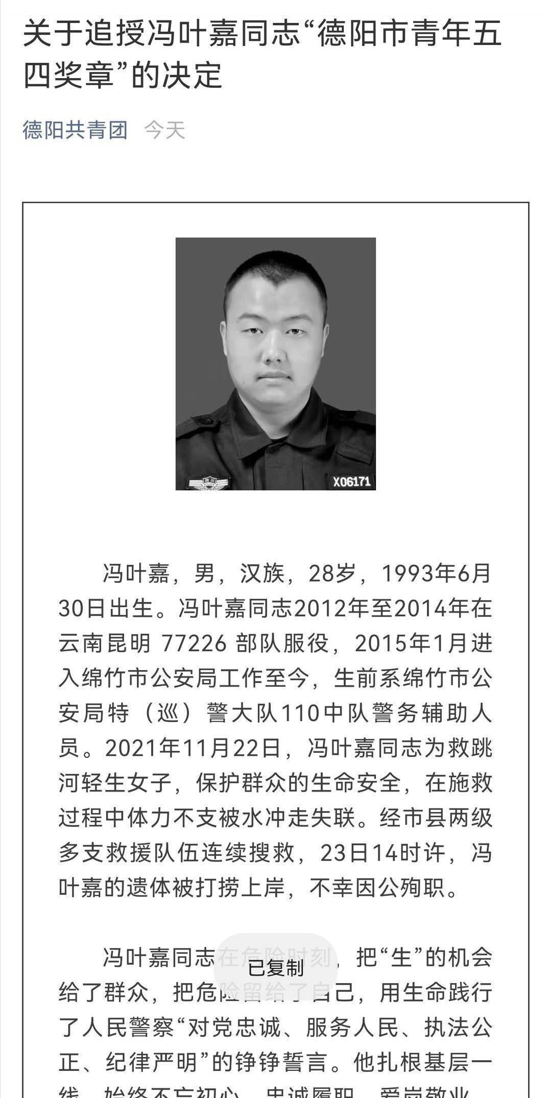 四川德阳绵竹市公安局特巡警大队辅警冯叶嘉年仅28岁,在上月22日的时候,为了营救跳河轻生女子,保护群众的生命安全,施救过程中将轻生女子托上岸之后,自己却因为体力不支被水冲走失联,最终丧生因公殉职。在危急时刻,将“生”的机会留给群众,把危险留给了自己,这样的责任担当、奉献精神让人敬佩!