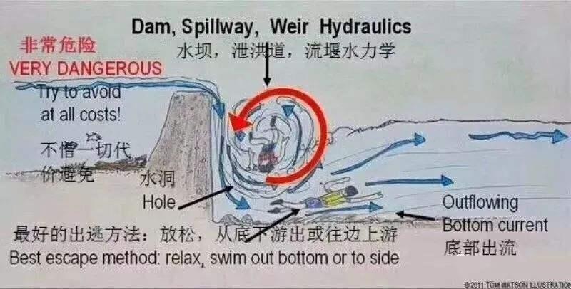那么如果不慎掉入滚水坝究竟应该如何逃生呢,都说最佳的逃生机会只有3秒,但那也是希望呀。首先,从滚水坝的危险性产生原理来说,如果掉进去了那么就只能从水底出,因为水面是出不来的,从水面出只会再次吸入水中!