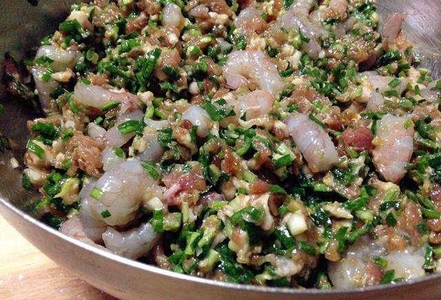 韭菜虾仁馅:虾仁、瘦猪肉、鲜韭菜各150克,姜末适量,盐,味精,老抽,生抽,花生油适量,香油少量。