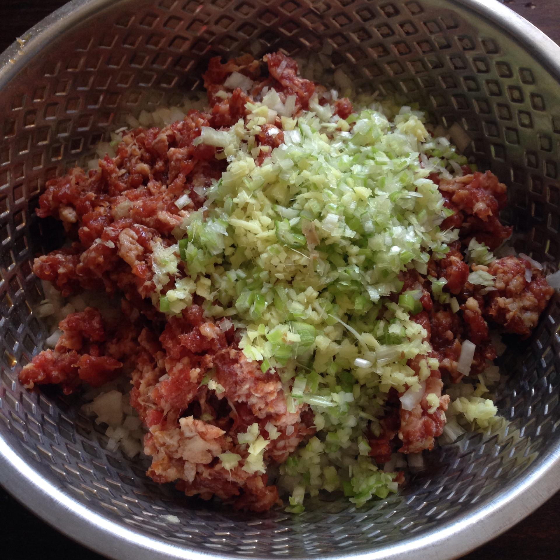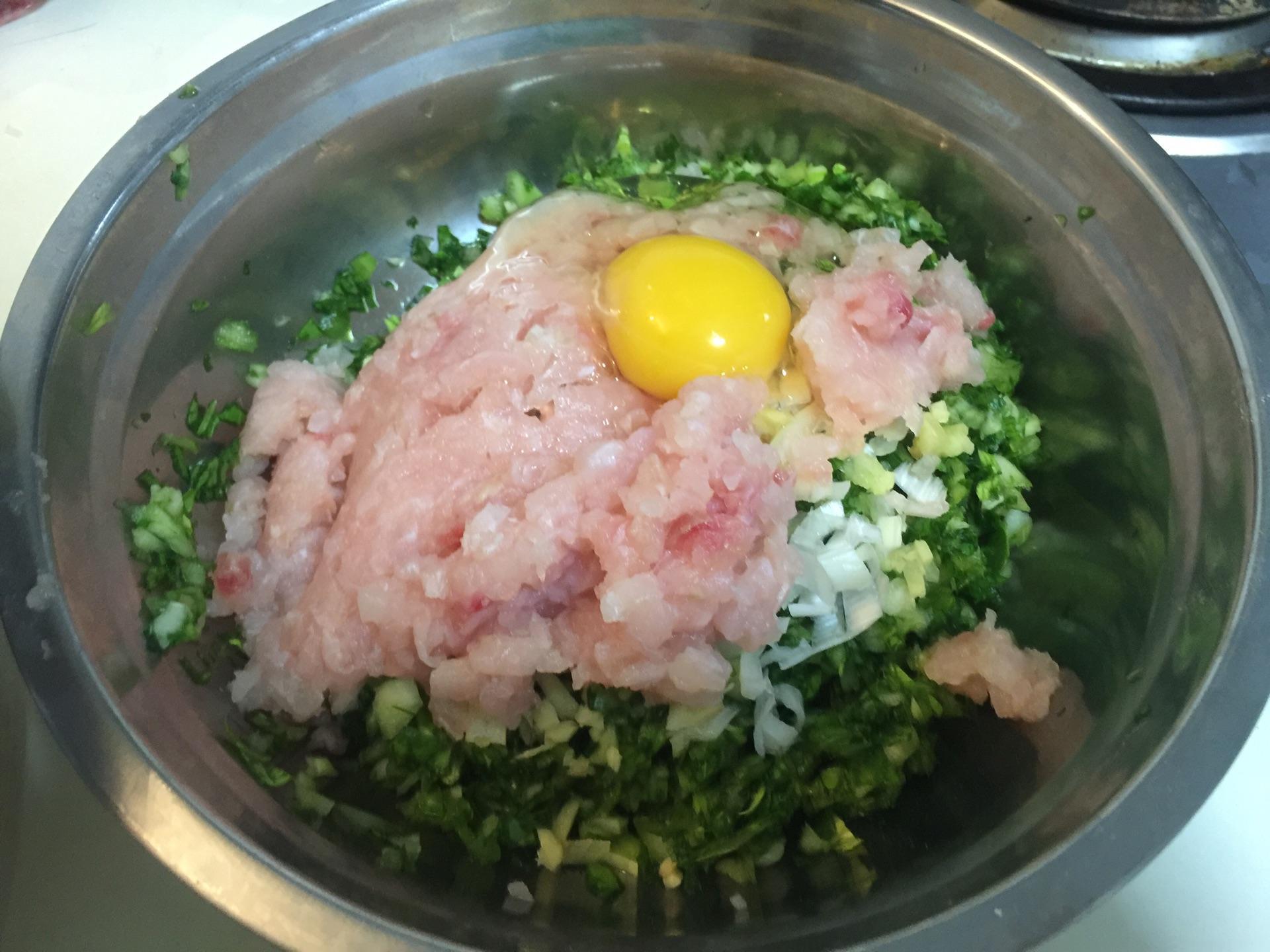 猪肉馅:五花肉,酱油,料酒,盐,香油,葱末,姜泥。