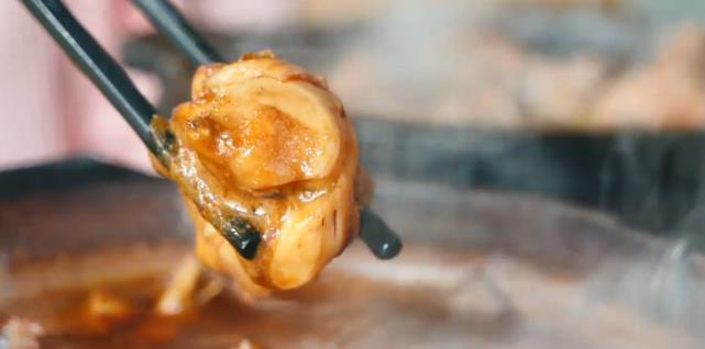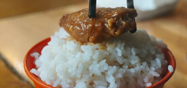 吃了之后非常想吃米饭,因为这玩意还是很下饭的。小吴直接从锅里边夹了一个鸡翅,然后放到白米饭上,让汤汁慢慢渗透进去,吃起来那叫一个美味!牛蛙煲的颜色是三个里最深的,煮的时候散发浓郁的酱香味。