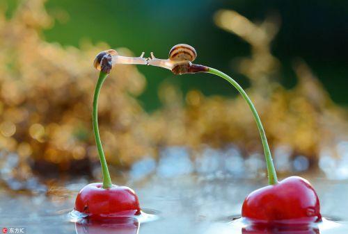 2014年3月25日报道,看来就算是再小的动物也会有浪漫的情感,你看,这两只小蜗牛颤颤悠悠的倚在两颗樱桃的梗上,伸长了脖子,用尽全力想要来一个甜蜜的吻。乌克兰别尔季切夫48岁的摄影师Vyacheslav Mischenko在林中散步时拍到了这温馨的一幕。来自东方IC